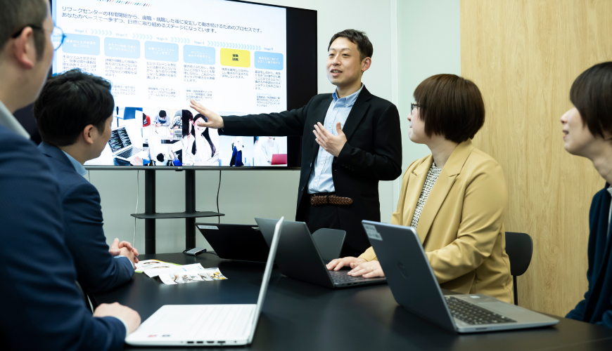 A: リワークセンターは、メンタルヘルスの不調により会社を休職中の方や離職した方が、安心してスムーズに復職や就職できるように支援しています。具体的なサポート内容としては、まず休職中や離職中にひとりで抱え込んでしまうような不安やお悩みを定期的にご相談いただけます。また復職や就職に向けて生活リズムの改善や働くための体力を取り戻すためのサポートや、職場復帰した際に再休職にならないように取り組むプログラムをおこなっていきます。個別最適な支援をおこなうため、リワークプログラムは多岐にわたります。そのプログラムから復職や就職に必要なご自身にあうプログラムを選択し取り組んでいきます。また主治医や会社(※ご希望により企業とは連携しないこともあります)と連携しながらサポートをおこないますので、職場復帰されるタイミングや復帰時の労働時間調整など、ご本人や関係者で相談しながら進めていきます。就職の場合は、就職活動に必要なレジメ作成時の添削や面接の模擬練習などもおこないます。復職や就職した後も、職場に慣れて安定して働き続けられるように、体調確認や職場での状況やヒアリングなどの定期面談をおこないます。